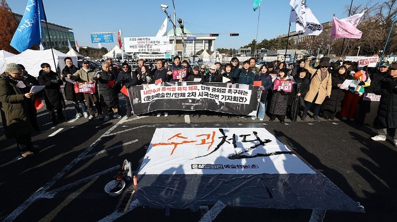 2024년 12월 14일 서울 여의도 국회 앞에서 윤석열 대통령 탄핵 결의를 촉구하는 문화예술인과 단체 2차 시국선언에서 참가자들이 구호를 외치고 있다. ©연합뉴스