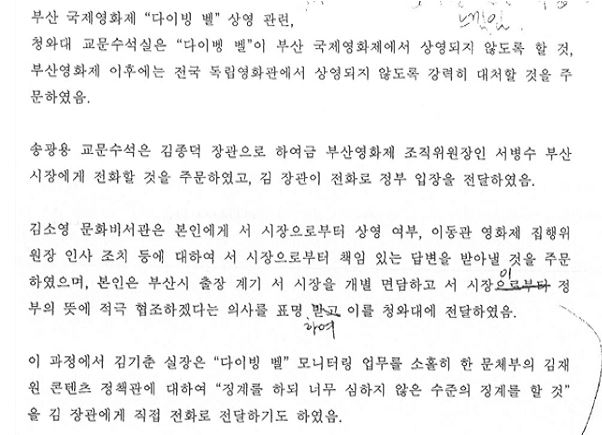 박근혜 정부 때 청와대가 세월호 문제를 다룬 다큐멘터리 영화 ‘다이빙벨’을 상영한 부산국제영화제에 전방위적으로 압력을 행사한 사실을 입증한 김희범 전 문체부 차관 작성 문건 ©연합뉴스