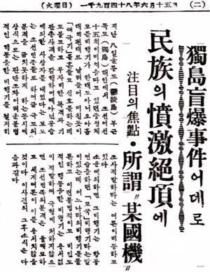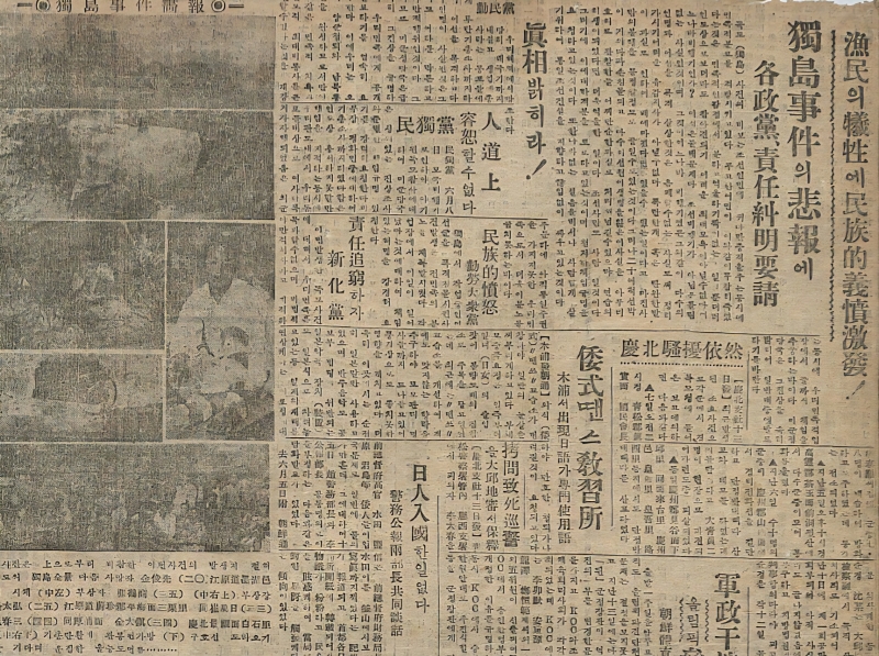 “어민의 희생에 민족적 의분 격발!”이란 제목으로 미군의 1차 독도 폭격 사건을 보도한 조선중앙일보(1948년 6월 16일)