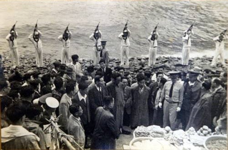 첫번 째 독도 폭격 사건이 발생한지 2주년이 되는 1950년 6월 8일 독도 동도의 몽돌해안에서 열린 '조난어민위령비' 제막식에서 우리 해군 병사들이 조총을 쏘고 있다.