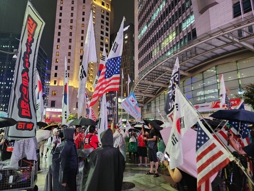 9월 12일 서울 여의도 국회 본청 앞 계단에서 열린 국민의힘 '야당 탄압 독재정치 규탄 대회'에 성조기, 부정선거 등 극우집회 깃발이 나부끼고 있다. ©연합뉴스