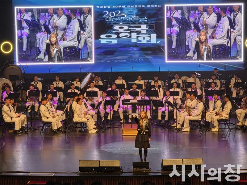 해군 제3함대사령부는 15일 오후 7시 목포시민문화체육센터 대공연장에서 해군 창설 80주년을 기념해 ‘전남도민과 함께하는 2025 대한민국해군 호국음악회’를 성대히 개최했다.사진은 초청가수 '경서' 공연모습(사진=송상교 기자)