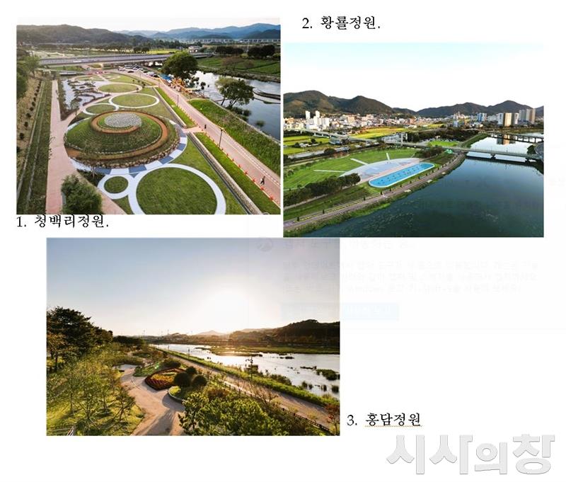 전통 오방색에서 착안해 황룡정원(황), 홍담정원(적), 청백리정원(백), 푸른물빛정원(청), 검은숲정원(흑) 등 색깔별 테마를 도입했으며, 여기에 작가정원과 시민참여정원을 보존한 ‘참여정원’이 더해져 황룡강 일대가 사계절 정원 도시로 변모하고 있다.