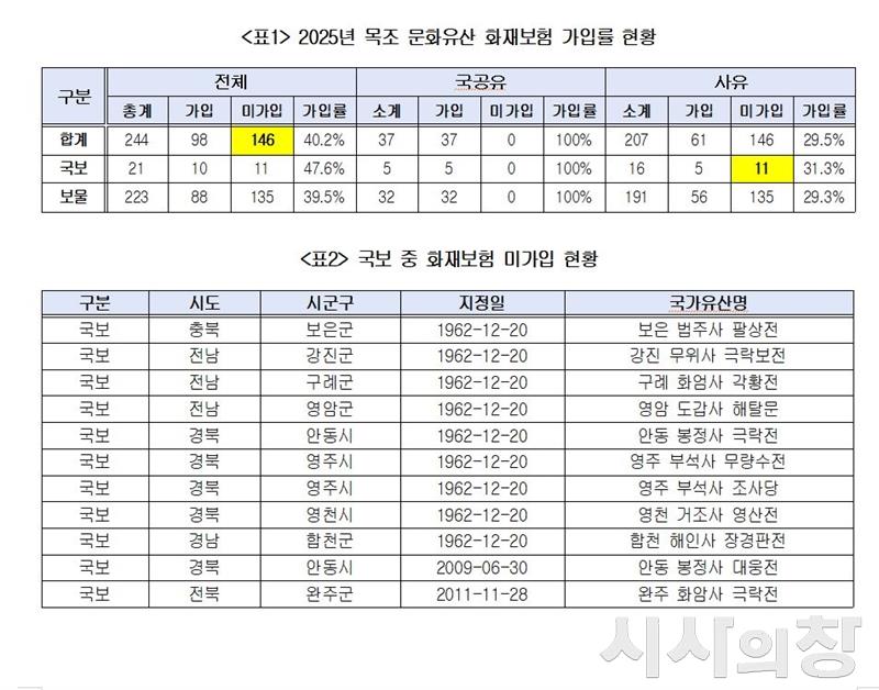 국회 문화체육관광위원회 소속 민형배 의원(더불어민주당, 광주 광산을)이 국가유산청으로부터 제출받은 자료에 따르면, 전국 목조 문화유산 244건 중 146건(59.8%)이 화재보험에 미가입 상태였다. 이 가운데 국보가 11건으로, 해인사 장경판전 등 유네스코 세계유산도 포함돼 있었다. 이미지는 2025년 목조 문화유산 화재보험 가입률 현황 및 국보 중 화재보험 미가입 현황.[시사의창 = 송상교 기자]