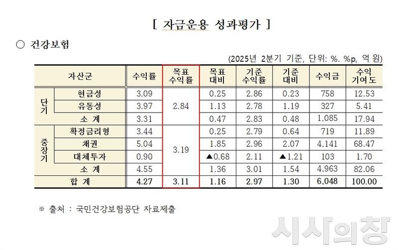 건보공단이 국정감사에 제출한 자료에 따르면, 2025년 2분기 건강보험 자금 총수익률은 4.27%로 연간 목표수익률(3.11%)과 기준수익률(2.97%)을 모두 상회했다. 그러나 대체투자 수익률은 0.90%로 기준 대비 –1.21%p 낮아, 자산군 간 성과 격차가 드러났다.