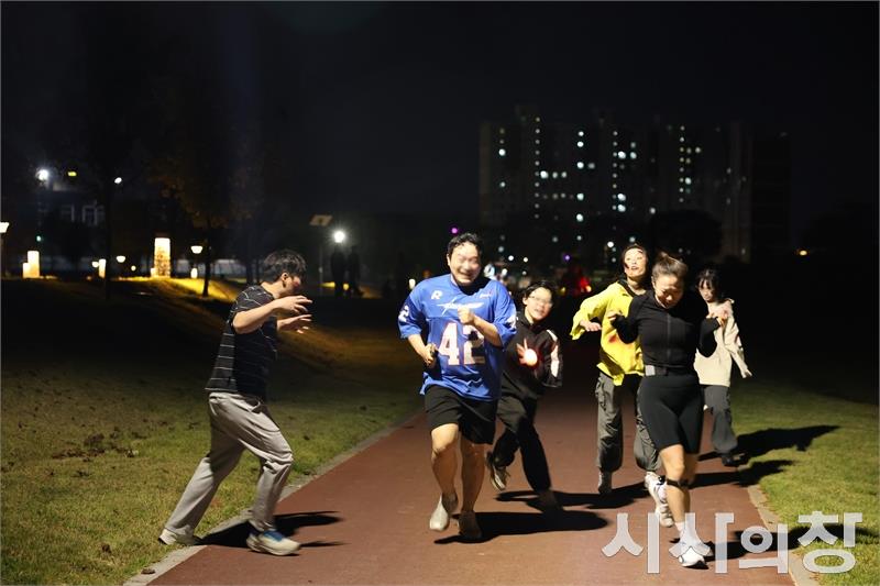 ‘J-라이트 런’은 기록 경쟁이 아닌 즐기는 체험형 달리기 행사로, 좀비와 저승사자 분장을 한 진행요원들의 추격을 피해 완주하는 색다른 콘셉트다. 참가자들은 어둠 속에서 불빛과 음악에 맞춰 달리며, 곳곳에서 벌어지는 ‘공포 체험’에 비명과 웃음을 동시에 터뜨렸다.