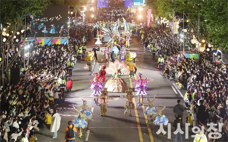광주 동구의 대표 가을 축제인 ‘제22회 광주 추억의 충장축제’가 ‘추억의 동화’를 주제로 5일간 금남로와 충장로 일대를 뜨겁게 달궜다. 지난 15일부터 19일까지 열린 이번 축제에는 약 50만 명의 인파가 몰리며 도심 전체가 ‘추억과 감성’으로 물들었다.사진은 롯데월드 테마파크 퍼레이드팀이 환상적인 퍼레이드 행렬을 선보이며 시민들의 환호를 받았다.[시사의창 = 송상교 기자]