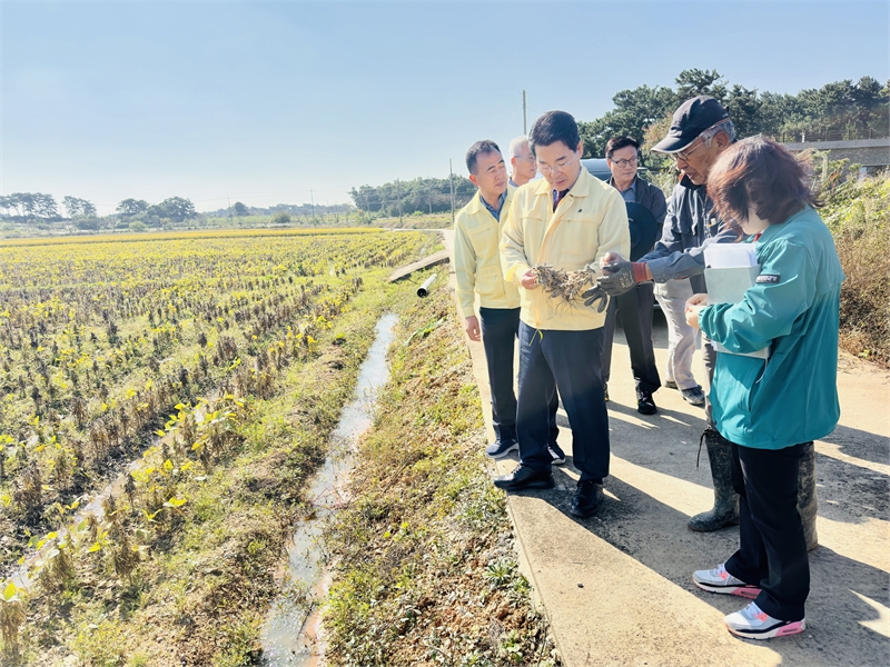 이날 권익현 군수는 장화를 신고 직접 논두렁을 걸으며 피해 상황을 세밀히 점검했다. 현장에서 만난 농민들은 “콩이 다 썩어버려 올해는 농사 망했다”며 한숨을 내쉬었다. 이에 권 군수는 “현장을 발로 확인하고 농민의 목소리를 직접 듣는 것이 행정의 기본”이라며, “농가의 피해를 최소화하기 위해 군의 모든 행정력을 집중하겠다”고 밝혔다.
