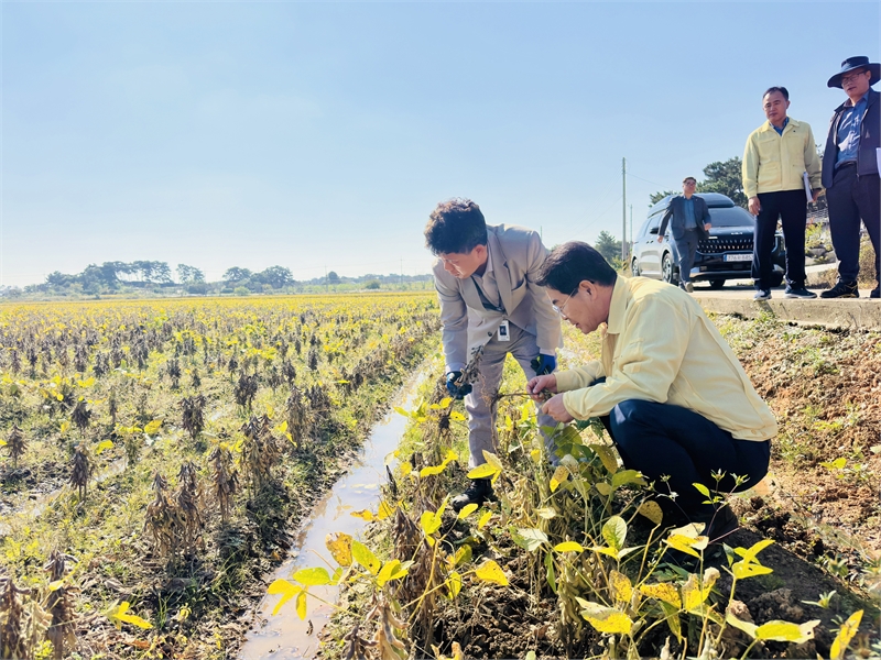 권익현 부안군수는 20일 동진면과 계화면 일대 논콩 피해 현장을 직접 방문해 농가의 어려움을 청취하고, 신속한 피해 복구와 실질적 지원 방안 마련을 지시했다 / 부안군 제공