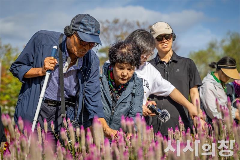 순천시는 지난 17일 순천만국가정원에서 한국시각장애인연합회 순천시지회 회원 23명과 관계자 등 30여 명이 참여한 가운데, 감성 치유 프로그램 ‘사운드순천’을 운영했다고 21일 밝혔다. 사진은 지난 17일 「사운드순천」에 참가한 시각장애인들이 순천만국가정원에서 꽃을 느껴보고 체험하고 있다