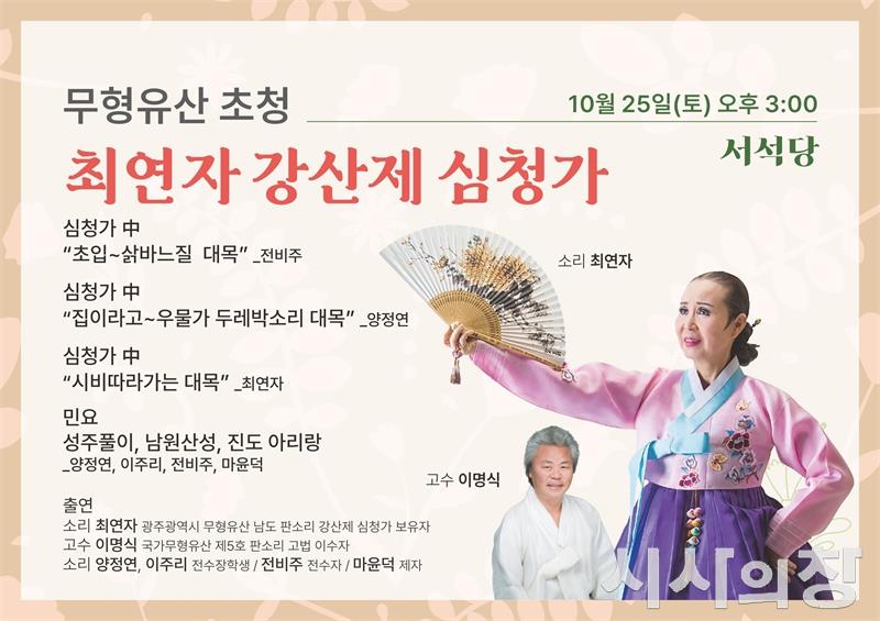 광주문화재단 전통문화관은 오는 10월 25일(토) 오후 3시, 토요상설공연 마지막 무대로 광주광역시 무형문화재 남도판소리 예능보유자 최연자 명창의 무대를 선보인다.[시사의창=송상교기자]