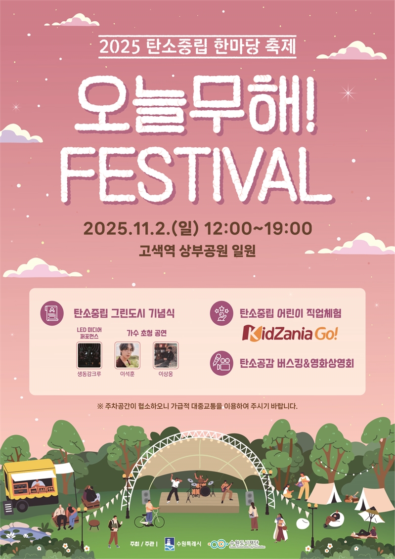 그린 캠크닉존, 리빙랩 전시, 푸드트럭존 등 가족 단위 체류형 프로그램도 함께 마련돼 시민 참여를 확장한다는 계획이다. 수원시 관계자는 “시민이 즐겁게 참여하며 탄소중립의 가치를 체감하는 축제”라며 지속가능한 탄소중립 그린도시로 나아가는 계기가 되길 바란다고 밝혔다.