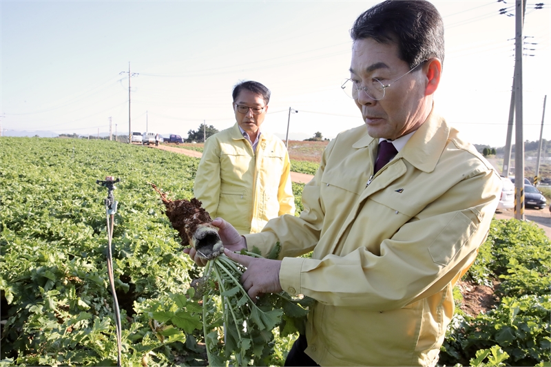 권 군수가 첫 번째로 방문한 박병양 농가는 가을무 59,400㎡를 재배 중이다. 두 번째로 찾은 신성일 농가는 가을배추 6만 6000㎡를 재배하고 있다. 두 농가 모두 “올가을 장마와 이상 고온으로 방제를 해도 무름병이 멈추지 않는다”며 깊은 한숨을 내쉬었다. 방제 효과가 미미한 채 병해충이 퍼지자 수확량 감소, 품질 저하, 출하 지연 등 삼중고에 시달리고 있는 것이다. 이들은 “농가의 힘만으로는 감당이 어렵다”며 정부의 직접 지원을 호소했다.