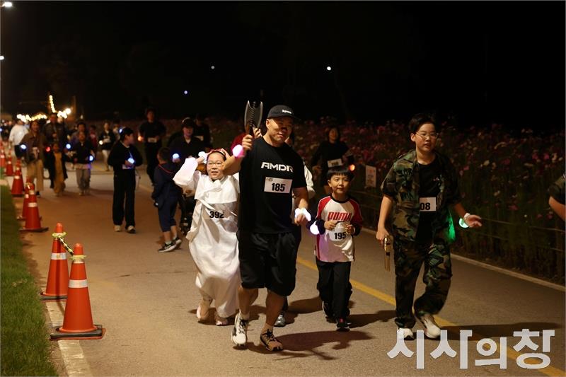 장성군 황룡강 가을꽃축제가 9일간의 여정을 마치고 지난 26일 막을 내렸다. 대한민국을 뜨겁게 달구고 있는 문화 콘텐츠들을 과감하게 도입해 지역 축제의 한계를 극복하고 ‘문화 중심지’ 도약의 첫걸음을 내디뎠다. 사진은 'J-라이트 런' 참가자들이 군복, 소복, 소품 등으로 분장한 채 달리고 있다. [시사의창=송상교기자]