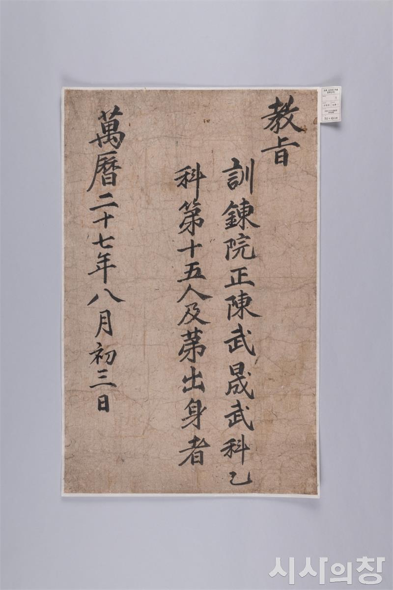 고흥군은 ‘고흥 무열사 소장 고문서’가 전라남도 유형문화유산으로 지정 예고 됐다고 30일 밝혔다.해당 고문서는 고흥군 두원면 신송리 동신마을에 위치한 여양진씨 송계공파종중(고흥문중)이 소유·관리하는 무열사에 소장된 자료이며, 현재는 조사와 연구를 위해 (재)한국학호남진흥원에 기탁·보관 중이다. 사진은 진무성 무과급제(홍패) 교지(1599)[시사의창=송상교기자]