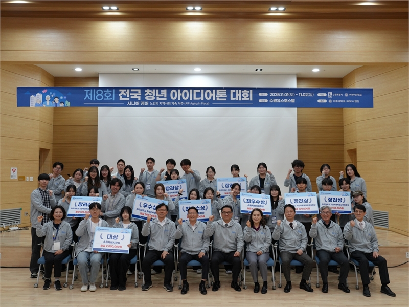 [시사의 창=조상연 기자] 수원특례시와 아주대학교가 공동 주최하고 아주대 RISE 사업단이 주관한 ‘제8회 전국 청년 아이디어톤 대회’에서 ‘도시형 이웃기반 청년과 노인 연결 모델’을 제안한 ‘이웃청년’ 팀이 대상을 수상했다. 대회는 ‘노인의 지역사회 계속 거주(AIP)’를 주제로 1~2일 수원유스호스텔에서 진행됐다.