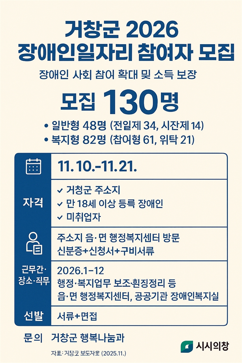 [시사의창=이태헌 기자] 거창군이 취업 취약계층인 장애인의 사회 참여 확대와 자립생활을 돕기 위해 ‘2026년 장애인일자리사업’ 참여자 130명을 모집한다. 접수 기간은 11월 10~21일이다.