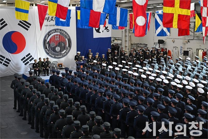 2025년 합동순항훈련전단이 11월 5일 진해 군항에서 출항 환송식을 갖고 합동순항훈련에 돌입한다.합동순항훈련은 국민에게 신뢰받는 첨단강군의 미래를 이끌어나갈 해·육·공군·국군간호사관생도들의 해군에 대한 이해도를 증진하고 합동성을 배양하기 위한 훈련이다. 사진은 11월 5일 진해 군항에서 열린 합동순항훈련전단 환송식에서 합동순항훈련전단이 작전사령관께 대한 훈련 신고를 하고 있다.[시사의창=송상교기자]