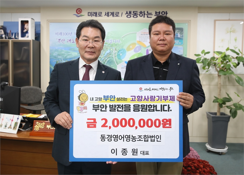 [시사의창=최진수기자] 부안군이 또 한 번 훈훈한 소식을 전했다. 이종원 동경영어영농조합법인 대표가 7일, 고향사랑기부금 200만원을 부안군에 기탁한 것이다. 지난해에 이어 올해도 연속으로 기부에 나선 그는 지역 농업인들의 귀감으로 떠올랐다.