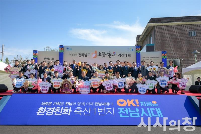 순천시는 지난 6일 순천광양축협 가축시장에서 열린 ‘제41회 전라남도 으뜸한우 경진대회’가 성황리에 마무리됐다고 밝혔다. 대회는 전라남도 지역 한우의 유전능력 평가를 통해 개량 성과를 측정하고 우량 한우를 보급해 지역 한우 산업의 경쟁력을 강화하기 위한 자리다. 사진은 지난 6일 순천광양축협 가축시장에서 열린 ‘제41회 전라남도 으뜸한우 경진대회’에서 주요 내빈과 수상자들이 기념촬영을 하고 있다