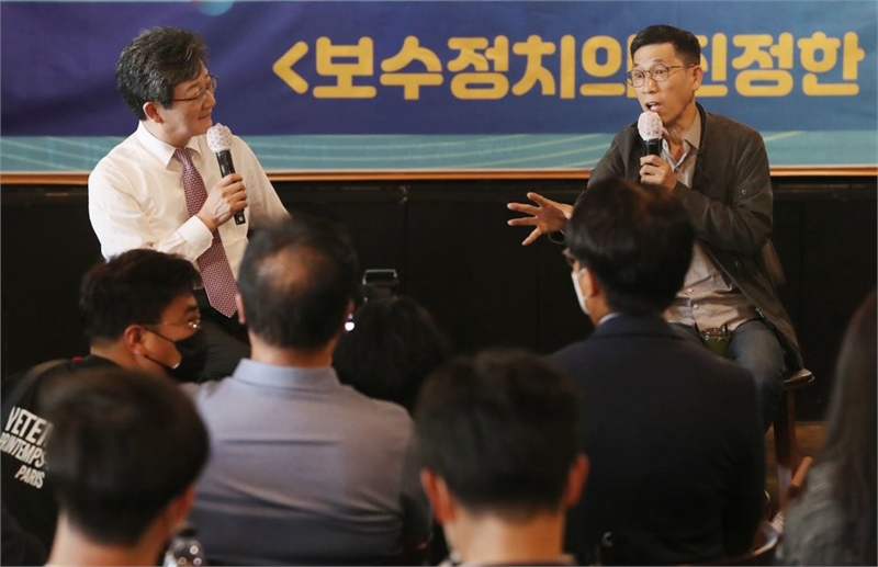 ‘희망22 동행포럼’ 창립총회에서 국민의힘 대권주자인 유승민 전 의원과 진중권 교수가 대담을 하고 있다. ©연합뉴스