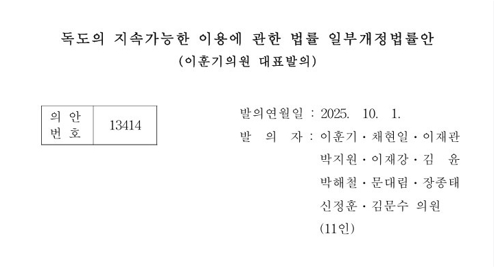 2025년 10월 1일에 더불어민주당 소속 이훈기 국회의원 등 11인이 ‘독도의 지속 가능한 이용에 관한 법률 일부개정 법률안’을 제안, 심의와 심사를 기다리고 있다.