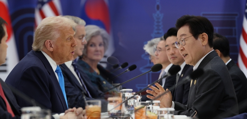 이재명 대통령과 도널드 트럼프 미국 대통령이 10월 29일 경북 경주박물관에서 한미 정상회담을 하고 있다. ©연합뉴스