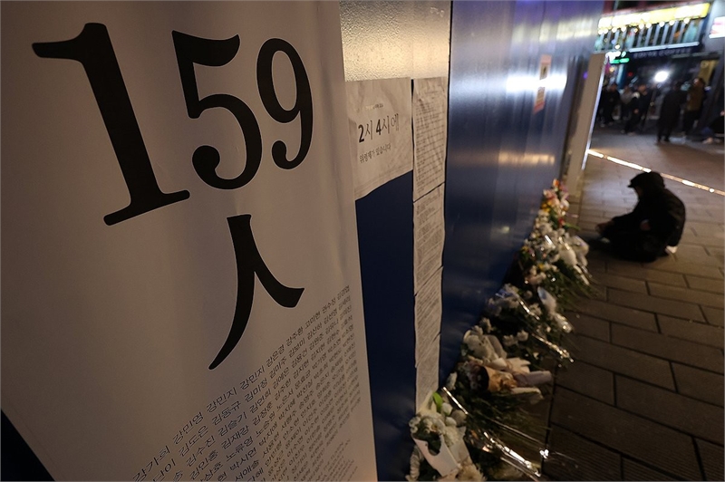 이태원 참사 현장에서 한 시민이 추모하고 있다. ©연합뉴스
