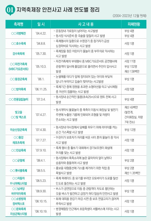 2017년부터 2019년까지 3년간 지역축제장에서 발생한 인명피해는 30명(사망 2명, 부상 28명). 이태원 참사 이후로도 축제 현장 사고는 계속됐다. 법과 매뉴얼은 수없이 만들어졌지만 사고는 반복된다. 왜일까?