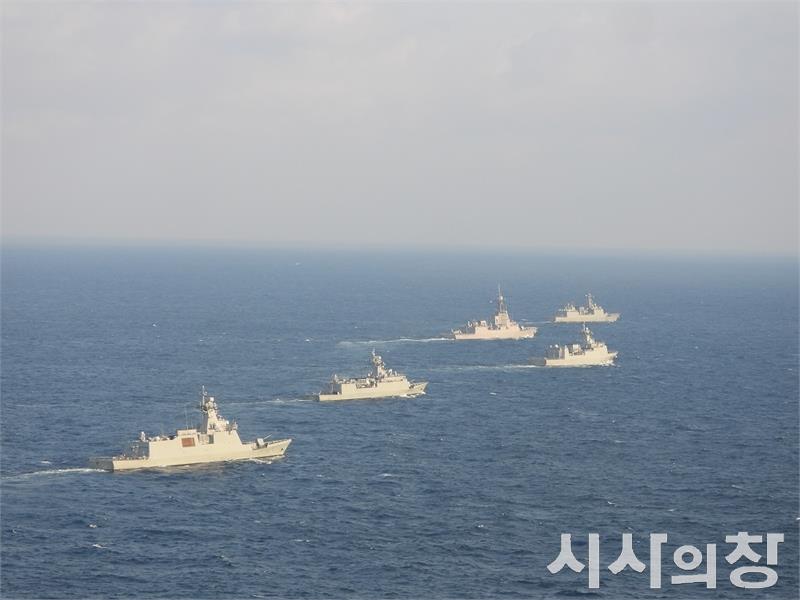 한국과 호주는 11월 6일부터 9일까지 남해상에서 연합작전 수행능력 및 상호운용성 강화를 위해 ‘한국ㆍ호주 연합훈련(해돌이-왈라비)’을 실시했다. 사진은 한국 해군과 호주 해군이 11월 6일부터 9일까지 남해상에서 '한국-호주 연합훈련(해돌이-왈라비)'을 실시한 가운데, 한, 호 해군 함정들이 지난 7일 연합 해상기동 훈련을 실시하고 있다. (왼쪽부터 경남함, 남포함, 전북함, 호주 해군 브리즈번함, 왕건함 순)[시사의창=송상교기자]