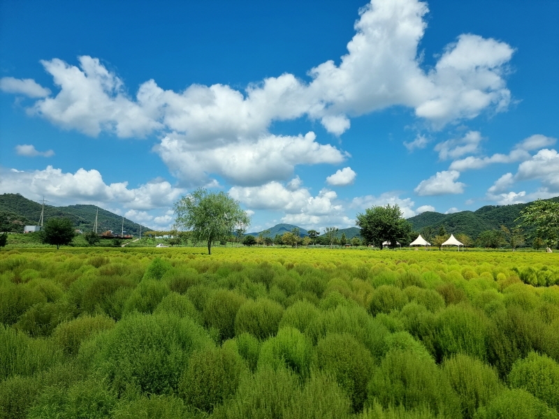 다음으로 호국의병의 숲 친수공원이다. 의령읍에서 차로 약 30여분 거리에 위치한 이곳은 무려 17㏊에 이르는 면적에 댑싸리, 황화 코스모스, 핑크뮬리, 아스타 국화, 메밀 등 다양한 꽃을 구경할 수 있다. 특히 광활한 부지에 조성된 댑싸리는 여름에는 여름 나름대로의 그 푸릇하고 몽글몽글한 모습이 귀여우면서도 아름답지만 아무래도 댑싸리의 진가는 가을의 색을 가득 머금은 10월에 방문하는 것이 최고다. 인생샷을 찍기에 부족함이 없는 공원으로서 연인이나 친구, 가족과 함께 산책한다는 생각으로 방문한다면 더없이 좋은 시간이 될 것이다.