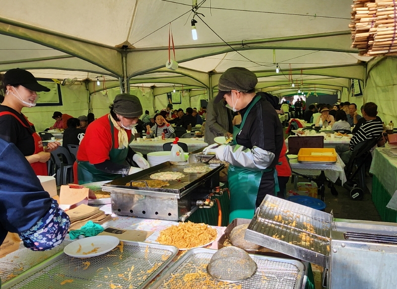 각 부스를 구경하고 월롱면 새마을부녀회가 운영하는 부스에 들어섰다. 넓은 부스에 손님들이 가득하다. 안내에 따라 겨우 자리를 차지하고 음식을 주문했다. 육개장 9,000원, 도토리전 8,000원, 막걸리 4,000원 등 여느 식당에서 먹는 가격보다 오히려 저렴하다.
