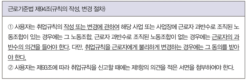 불이익하지 아니한 취업규칙 변경의 경우 사용자는 과반수 노조가 있는 경우 그 노조, 과반수 노조가 없는 경우 근로자 과반수의 의견을 들어야 함.