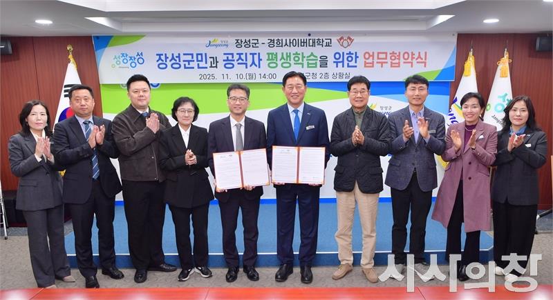 장성군이 10일 군청 상황실에서 경희사이버대학교와 업무협약을 체결했다. 협약에 따라 두 기관은 군민·공직자 평생교육 기회 확대, 지역 기반 학습 프로그램 개발, 온·오프라인 교육 연계사업 등을 공동 추진할 계획이다.[시사의창=송상교기자]