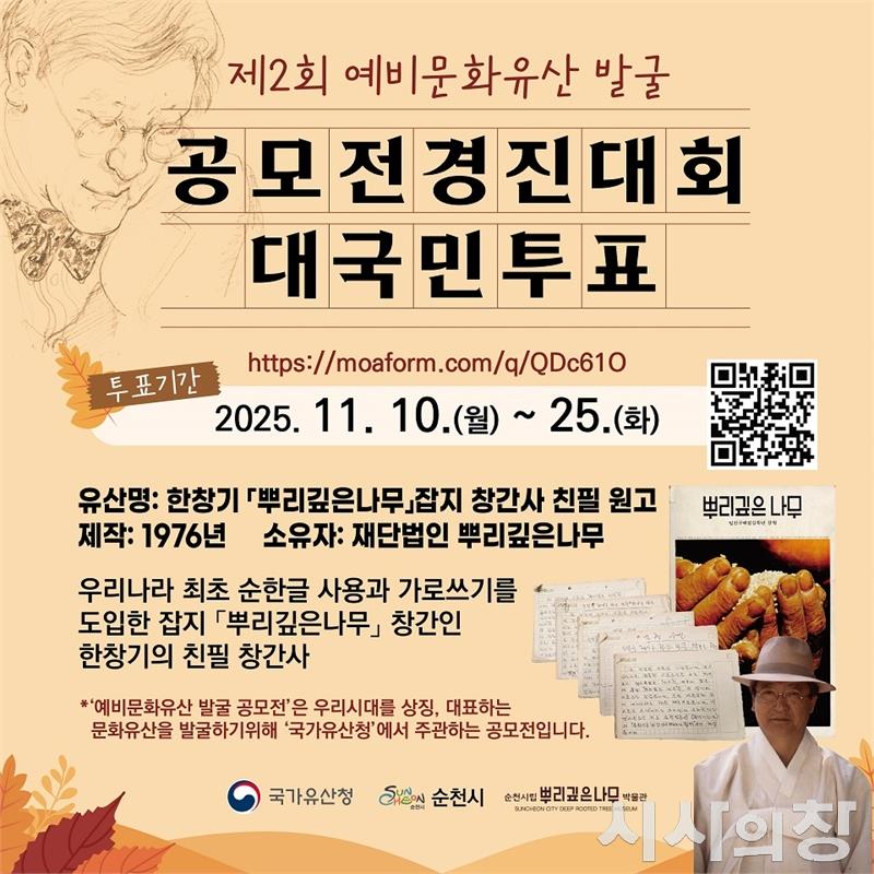 순천시와 뿌리깊은나무재단은 순천뿌리깊은나무박물관에서 소장하고 있는 故한창기 선생의 「뿌리깊은나무」 잡지 창간사 친필원고가 국가유산청 주관 ‘제2회 예비문화유산 발굴 공모전’ 최종 후보에 선정됐다고 밝혔다. 예비문화유산 발굴 공모전은 국민과 함께 우리 시대를 대표하는 예비문화유산을 발굴하고, 미래문화자원으로서의 가능성을 모색하기 위해 국가유산청에서 주관하는 사업이다.