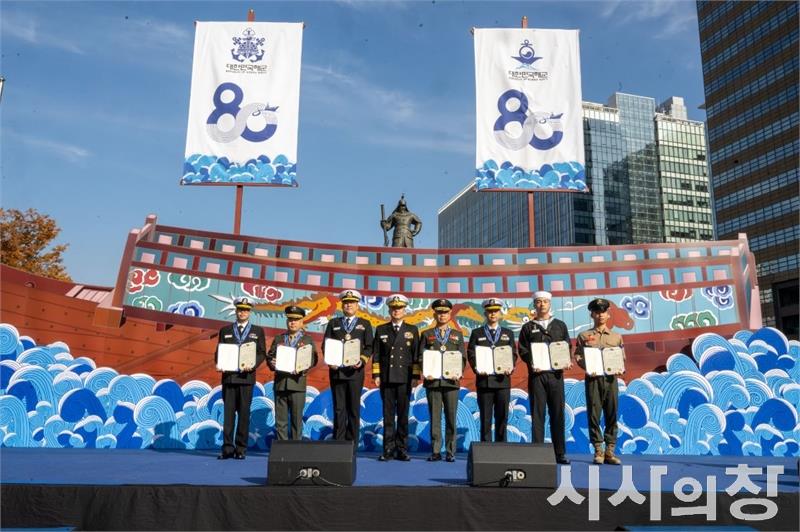 해군은 11월 11일 오전 서울 광화문광장 이순신장군동상 앞 특설무대에서 강동길 해군참모총장 주관으로 제80주년 해군창설기념식을 개최했다.사진은 11월 11일 서울 광화문광장 충무공 이순신 동상 앞 특설무대에서 진행된 제80주년 해군창설기념식에서 강동길(대장) 해군참모총장과 모범장병 표창을 수상한 해군ㆍ해병대 장병들이 기념사진을 촬영하고 있다.[시사의창=송상교기자]