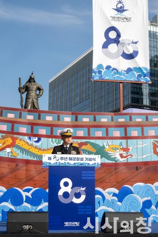 해군은 11월 11일 오전 서울 광화문광장 이순신장군동상 앞 특설무대에서 강동길 해군참모총장 주관으로 제80주년 해군창설기념식을 개최했다.사진은 11월 11일 서울 광화문광장 충무공 이순신 동상 앞 특설무대에서 진행된 제80주년 해군창설기념식에서 강동길(대장) 해군참모총장이 기념사를 하고 있다.[시사의창=송상교기자]