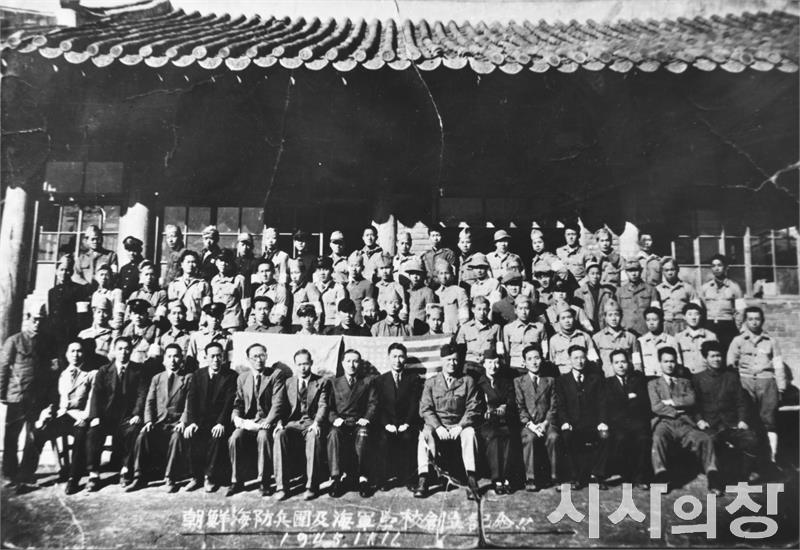 1945년 11월 11일 서울 종로구 관훈동 표훈전에서 거행한 해군의 모체인 해방병단 창설 기념사진이다. 의자에 앉은 앞줄 오른쪽에서 네 번째가 초대 해군참모총장인 손원일 제독.[시사의창=송상교기자]