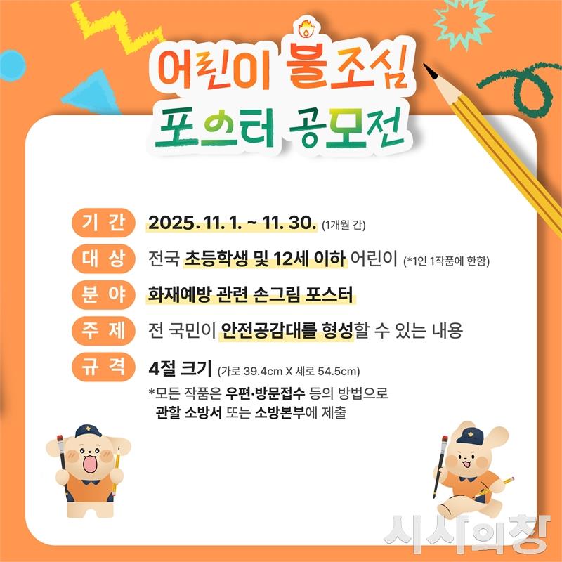 해남소방서가 11월 불조심 강조의달을 맞아 이달 21일까지 지역 내 초등학생 및 12세 이하 어린이를 대상으로 불조심 포스터 공모전을 개최한다.[시사의창=송상교기자]