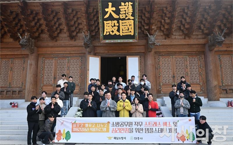 해남소방서가 11일부터 13일까지 해남 대흥사에서 직원의 마음건강 회복 및 재충전을 위한 특별프로그램을 운영한다고 밝혔다.이번 프로그램은 소방공무원의 불규칙한 근무형태로 인한 정신적 피로 및 번아웃을 해소하고 조직 내 심리적 안정과 회복을 증진하기 위해 마련됐다. [시사의창=송상교기자]