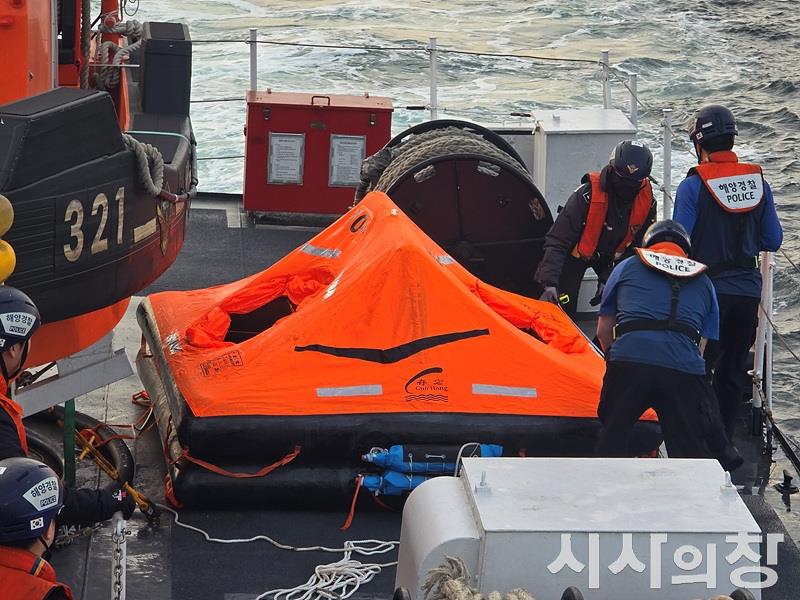 서해지방해양경찰청은 지난 10일 군산시 어청도 인근 해상 전복 중국어선 A호(유망, 99톤급, 11명)의 실종자들(9명)을 찾기 위한 이틀째 수색을 이어가고 있다고 11일 밝혔다.사진은 서해해경청이 사고선박 주변해역에서 표류중인 구명벌 1대를 수거했다.[시사의창=송상교기자]