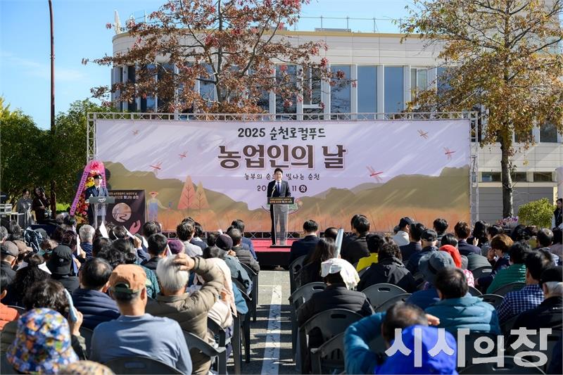 순천로컬푸드(주)는 지난 11일 국가정원 동문 대형주차장에서 ‘2025 순천로컬푸드 농업인의 날’ 행사를 열고, 지역 농업인의 노고를 격려하며 순천형 농업의 지속가능한 발전을 다짐했다.이날 행사는 로컬푸드 생산자와 소비자가 함께 참여하는 상생과 교류의 장으로 마련. 사진은 지난 11일 국가정원 동문 대형주차장에서 열린 ‘2025 순천로컬푸드 농업인의 날’ 행사에서 노관규 순천시장이 인사말씀을 하고 있다