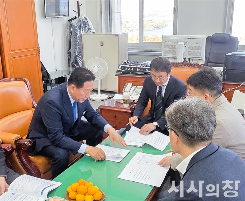 장성군에 따르면 12일 김한종 장성군수를 비롯한 관계 공무원들이 국회를 방문해 한병도 예산결산특별위원회 위원장, 산업통상자원중소벤처기업위원회 김원이 의원과 면담을 가졌다. 안도걸·조계원·주호영 의원실에는 현안사업 관련 자료를 전달하고 사업 추진의 당위성을 알렸다.사진은 12일 김한종 장성군수(좌측)가 한병도 예산결산특별위원회 위원장에게 현안사업 추진의 당위성을 설명하고 있다. [시사의창=송상교기자]