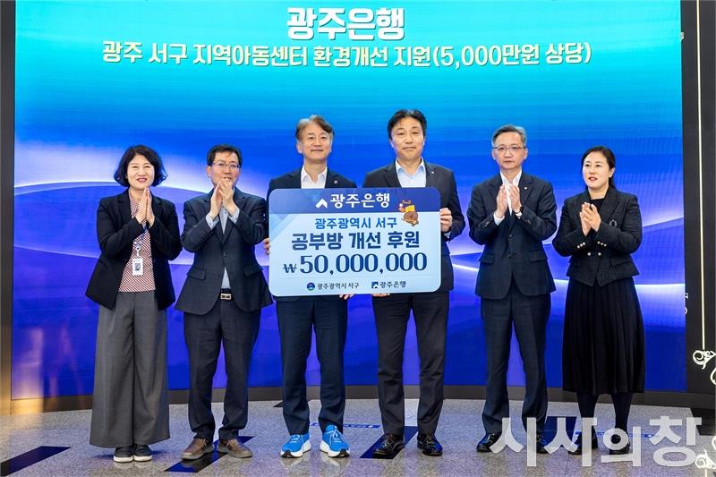 광주은행은 11일 광주 서구청에서 ‘희망이 꽃피는 공부방’ 사업을 위한 후원금 5천만 원을 기탁했다. 이번 후원금은 서구 관내 지역아동센터 4개소의 환경 개선에 사용됐다. 아동의 안전을 위한 방염 벽지 및 장판 교체를 비롯해 학습용 책상·의자 교체, 생활공간 내 수납시설 및 싱크대 개보수 등 시설 전반의 환경을 정비했다.[시사의창=송상교기자]