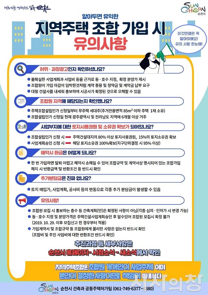순천시는 최근 지역주택조합 아파트 사업과 관련해 과장 광고나 불충분한 정보 제공으로 인한 시민들의 피해가 우려된다며, 조합 가입 전 철저한 확인을 당부했다.이미지는 지역주택조합 가입 시 유의사항