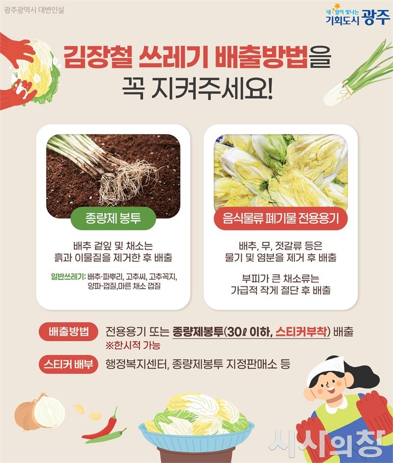 [시사의창=송상교기자] 광주광역시(시장 강기정)가 "본격적인 김장철을 맞아 오는 11월 17일부터 12월 19일까지 ‘김장철 음식물쓰레기 집중 관리 기간’을 운영하고, 김장용 채소류에 한해 스티커 부착 종량제봉투 배출을 한시적으로 허용한다"고 13일 밝혔다.
