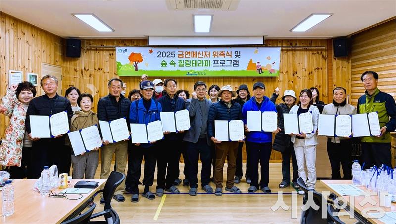장성군이 11일 국립장성숲체원 산림교육센터에서 ‘금연 클리닉’ 등록 주민과 가족 20여 명을 대상으로 ‘금연 메신저 위촉식 및 숲속 힐링 테라피 프로그램’을 열었다.이번 행사는 3개월과 6개월간 금연에 성공한 사람들이 꾸준히 담배를 끊을 수 있도록 도움을 주기 위해 마련됐다. 사진은 장성군이 11일 국립장성숲체원 산림교육센터에서 금연 메신저 위촉식을 가졌다. [시사의창=송상교기자]