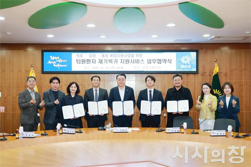 화순군(군수 구복규)은 내년 3월부터 본격 시행되는 의료·요양·돌봄 통합지원사업에 선제적으로 대응하기 위해 군청 소회의실에서 ‘퇴원환자 재가복귀 지원서비스’ 업무 협약을 체결했다고 13일 밝혔다.이번 협약은 병원 치료를 마친 뒤 가정으로 복귀하는 환자들이 지역사회 내에서 안전하고 지속적인 돌봄을 받을 수 있도록 지원하기 위해 마련됐다.[시사의창=송상교기자]