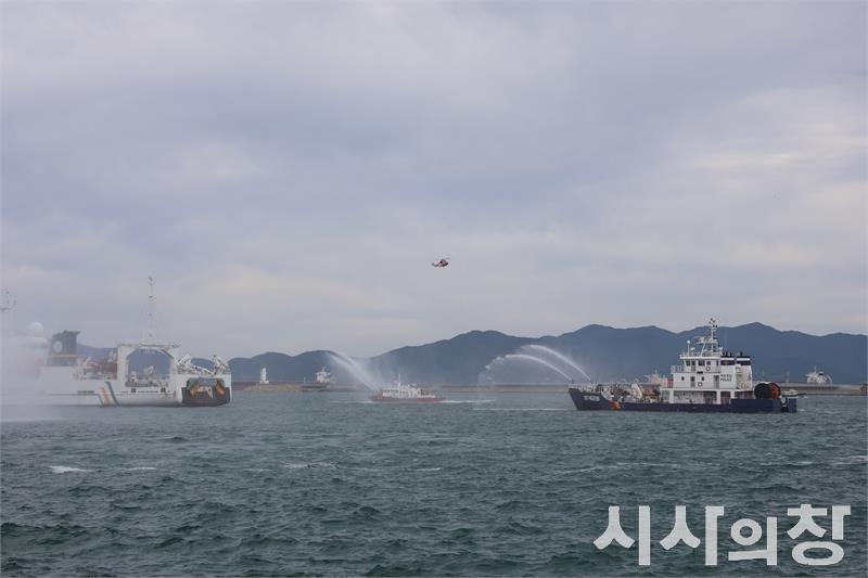 여수해양경찰서은 지난 12일(수) 여수 신항 해상에서 2025년 제4차 민·관·군 합동 수난대비기본훈련을 실시했다고 13일 밝혔다.이번 훈련은 2025년 소방청 국가단위 긴급구조종합훈련과 병행으로 실시되며, 최근 기후 위기 속에서 발생할 수 있는 신종 재난인 지진 상황에 대비해 범국가적 재난대응 체계를 확립하기 위한 것이다. 사진은 여수해경 방제함에서 소화포 이용 모의선 화재를 진압하는 장면.[시사의창=송상교기자]