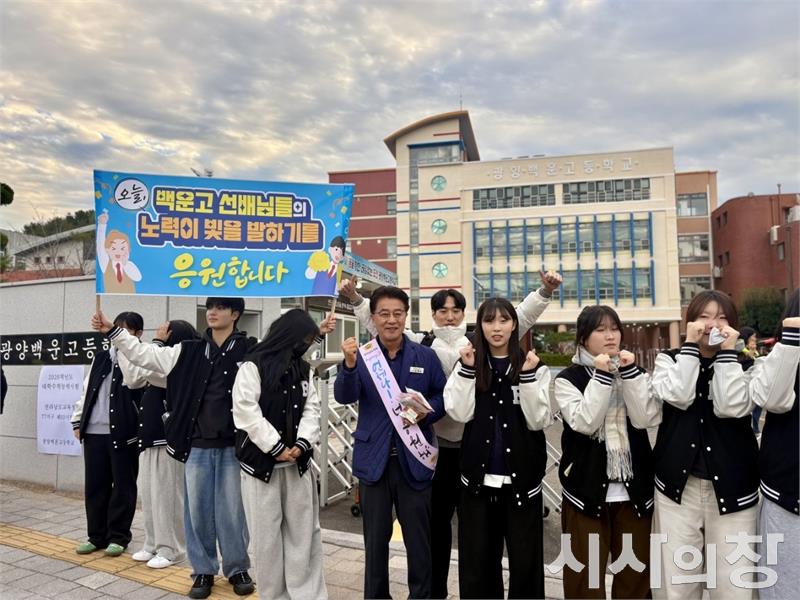 전라남도의회 김태균 의장은 11월 13일(목) 대학수학능력시험 당일 아침 7시 20분부터 광양 백운고등학교를 찾아 수험생들을 격려하고 응원의 메시지를 전했다.[시사의창=송상교기자]